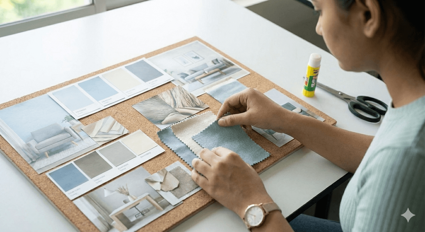 Once you have a solid foundation, it’s time to bring your ideas to life. A crucial part of this is creating a mood board, which helps you visualize the color palette, materials, and overall aesthetic of a space. Our students learn to curate these elements meticulously, as seen in the image below, where the student from the previous step is now arranging fabric swatches and color chips.