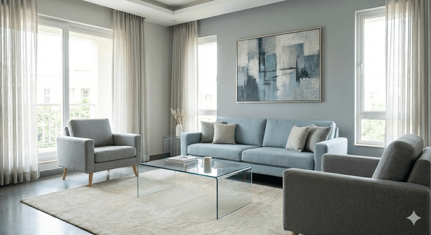 The final step is to translate your concepts into reality. Our program provides you with the skills to execute your designs, from selecting furniture to finalizing the lighting. The result is a stunning, functional space that reflects your unique style. The image below is the beautiful realization of the student’s work, a modern living room that perfectly incorporates the blue and grey color palette from her mood board.
