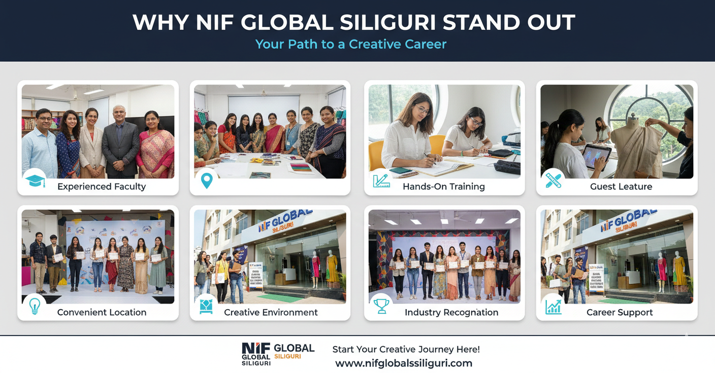 Choosing the right fashion design college is an important decision. NIF Global Siliguri combines quality education, practical training, experienced faculty, and convenient location – everything you need to succeed in the fashion world.